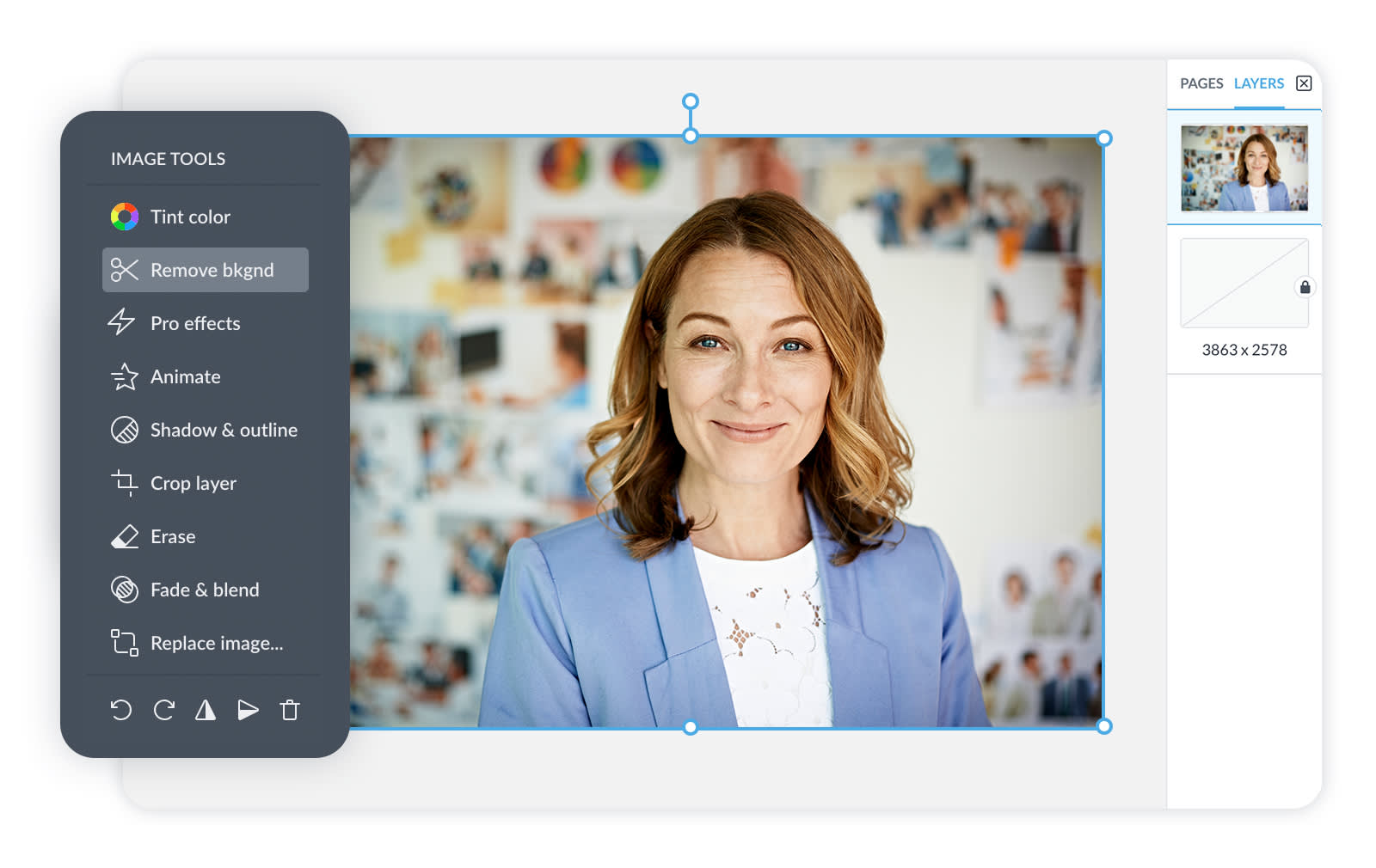 To remove the background from an individual image layer, select the layer from the Layers panel, or your canvas. The Image Tools menu will open on the left panel. Click Remove bkgnd and...