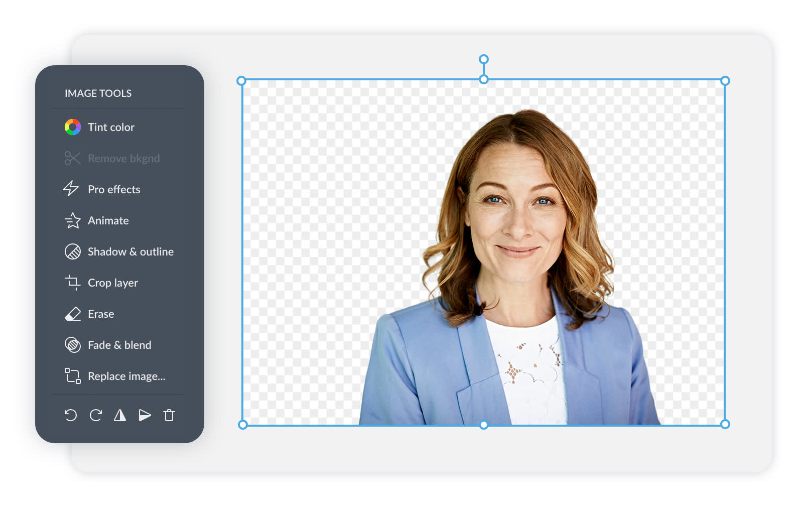 Removing a photo background is so easy: just open a photo, click Remove bkgnd on the Background Tools menu, and poof, it’s gone. Magic! No other photo editing and design platform lets you do automatic background erase as quickly and as thoroughly as we do. After your background is removed with one click (can’t get enough of that!), use the eraser or paintbrush tools to remove even more, or to paint back on any part of the erased background. Here's how.