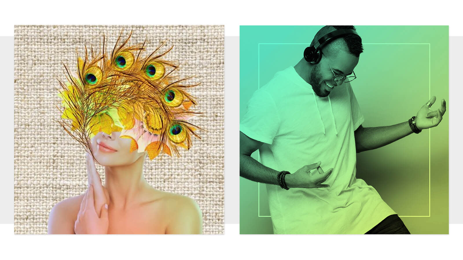 Color gradients bring photo tinting into the 21st century with some subtly luxurious lewks. They can also be used to pump up the visual interest in a photo that's not inherently dynamic. You can use our miracle-working background remover tool to isolate your photo subject and add the gradient to just that part of your design (like Wendy Power's design on the left, above) or add a gradient effect to the entire photo (like our PicMonkey design on the right).