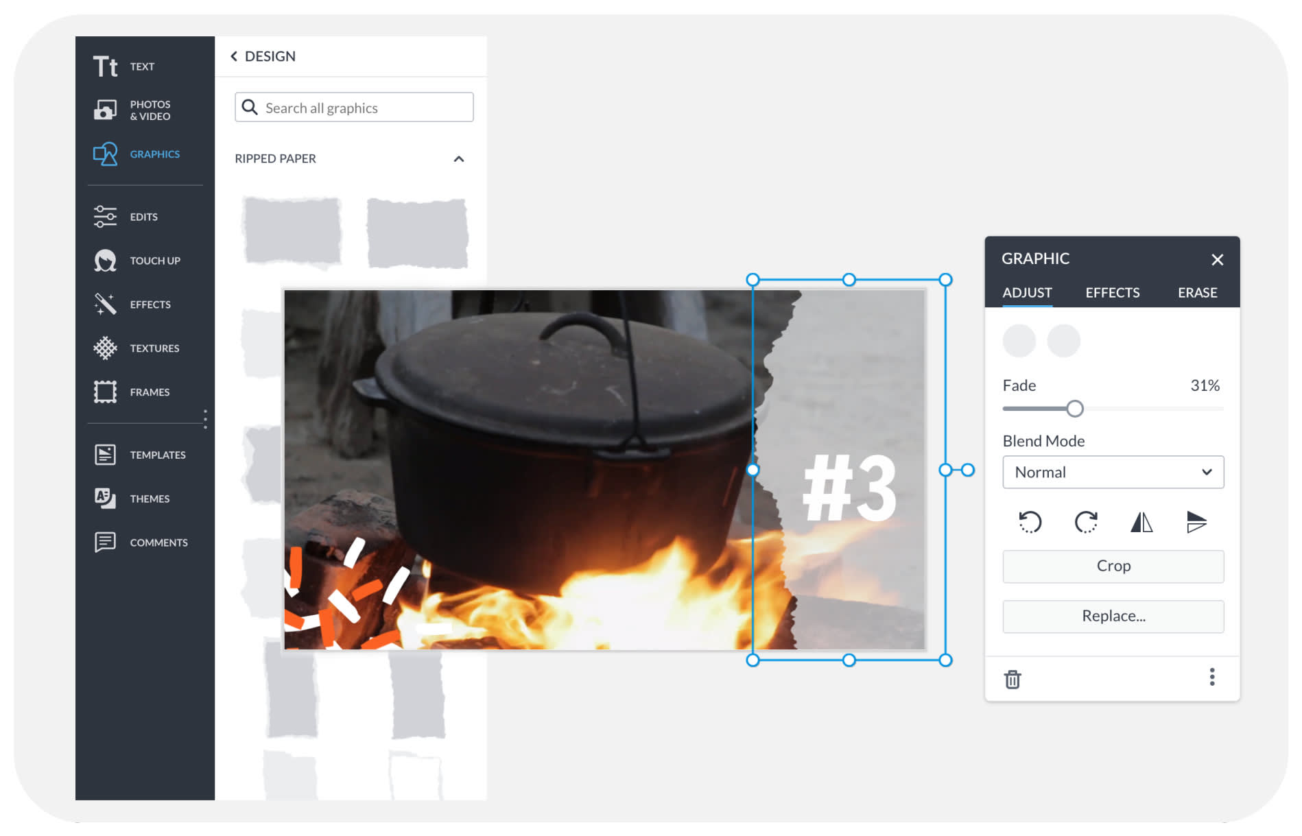 Whether you’re making title cards, lower thirds, or fun elements to use throughout your video, our huge library of vector-based, customizable graphics will bring the visual interest bigtime. (Need a quick refresher? See How to Use Graphics to brush up.) In the Graphics tab (the three shapes icon on the left hand side of the editor) you can choose from thousands of graphic overlay options — from food and drinks to banners and animals to sunglasses and squiggles, and so much more. Use them as-is or change the colors, erase parts of them, and transform them into something else entirely.
