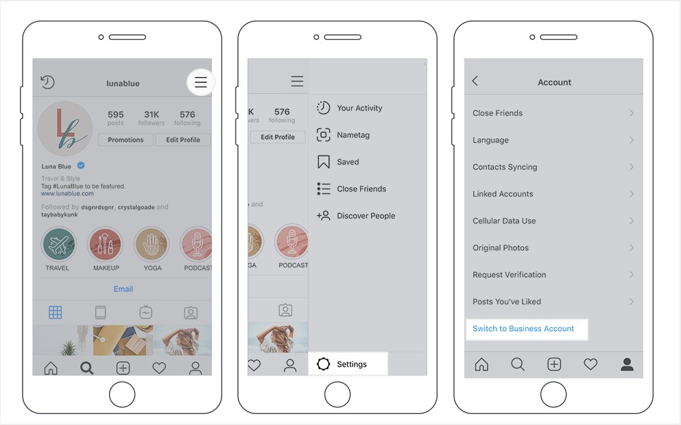 If you already have a regular account, it’s easy to convert it to an Instagram business account. Just go to the Settings in your profile, tap Account, and tap Switch to Business Account. You’ll also need to connect your new business account to a Facebook Page so you can access all the available tools and features, including the ability to advertise on Instagram.