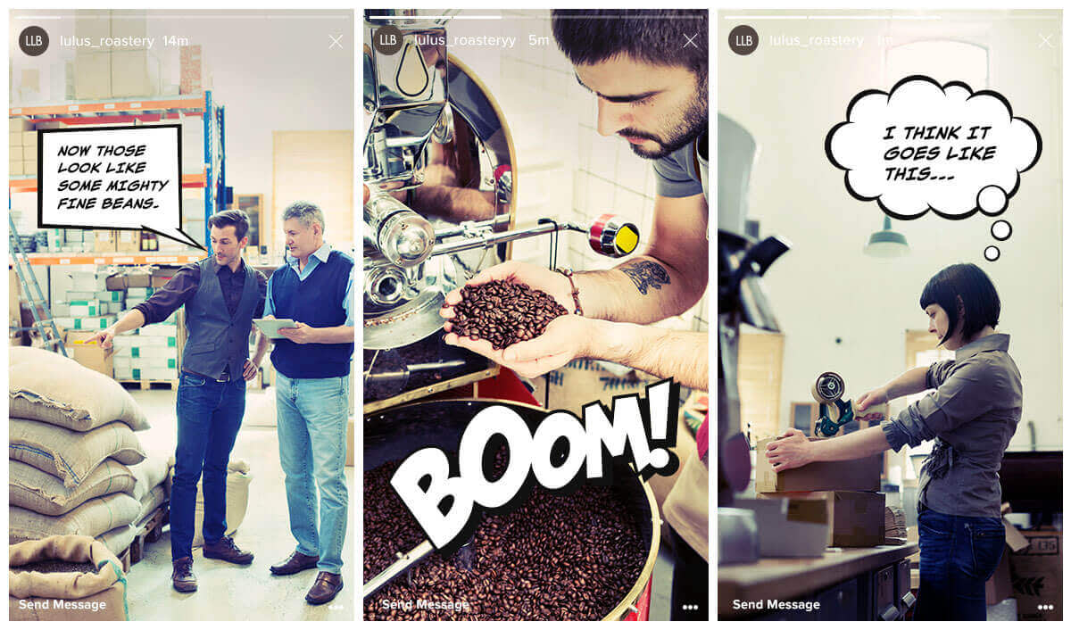 Remember, your stories should always have an easy, unfinished feel to the them. That means you should dispense with the lighting and tripods when you shoot your photos or videos and just go with natural light and a handheld camera or phone. And don’t be afraid to get in close to your subject. In our story above, you can practically smell the coffee being roasted!