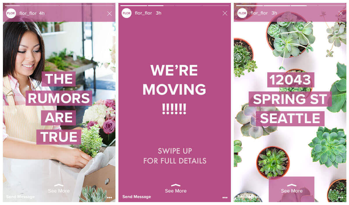 Making important—or not so important—announcements with Instagram Stories is a clever way to get attention and capitalize on the immediacy of the platform. Announcements might include the addition of new a product to your line-up, hiring a key employee, expanding into new territory, or forming a partnership with a related business. There are lots of ways to make your announcement as well. You can use a series of images to do the big reveal, record a video, or use Instagram’s live-streaming option. Some companies will hold an event via Facebook Live and use Stories to promote it.