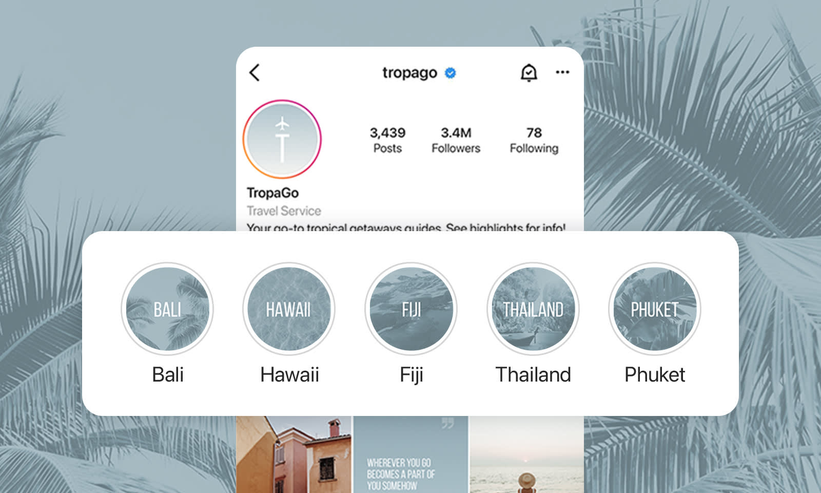 Instagram asks professional account holders to categorize their page by profession. So, we say, why not use that label to your advantage? If you're a travel service like @tropago, why not make travel the theme that dictates font, icon graphics, and overall vibe?