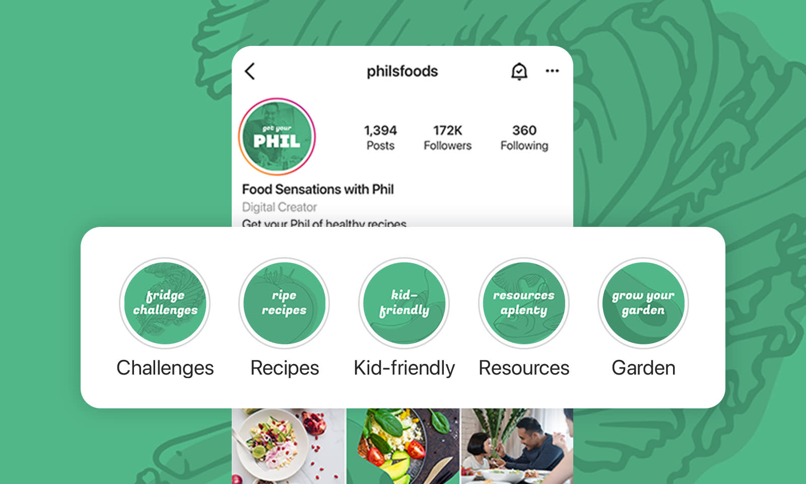 Pro Tip: Choose different food graphics to distinguish your Instagram cover icons. Using the same graphic for each category can blur concepts for your audience. In a skim-and-scroll culture, the more diversity you include, the longer people will stick around!
