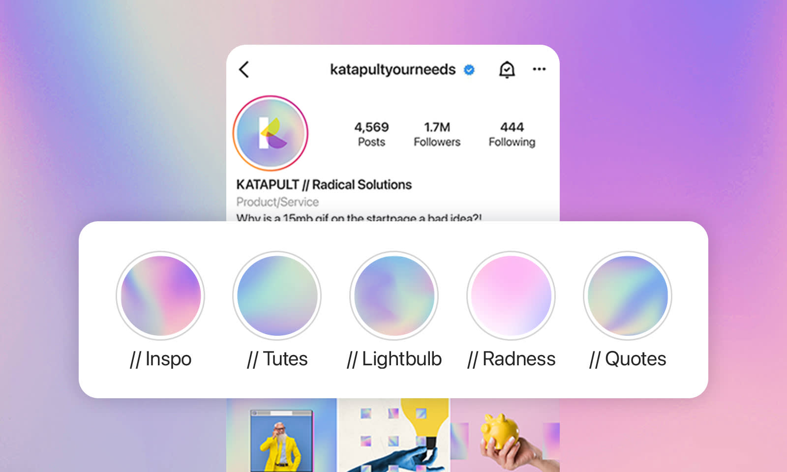 Color gradients are the perfect way to add dimension and pizzazz to your Instagram Highlight covers. Whether you're a product/service page like @katapaultyourneeds, an EDM music producer, or a trendy influencer, the right colors can impact your mood as well as your followers'.