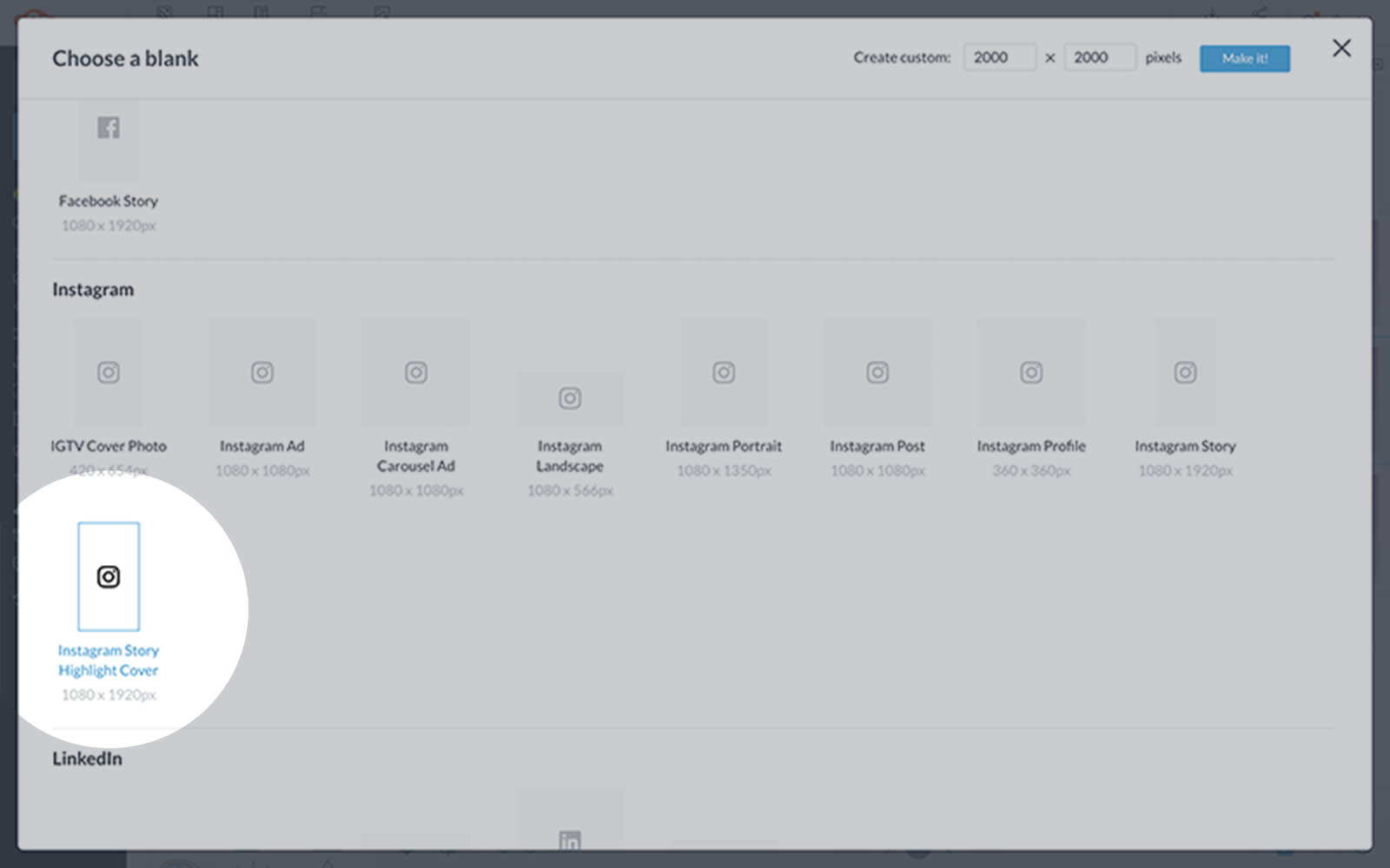 In PicMonkey, scroll down to the Blanks section and click See all blanks. From there you’ll be taken to a page where you can choose your blank canvas size. Select Instagram Story Highlight Cover.