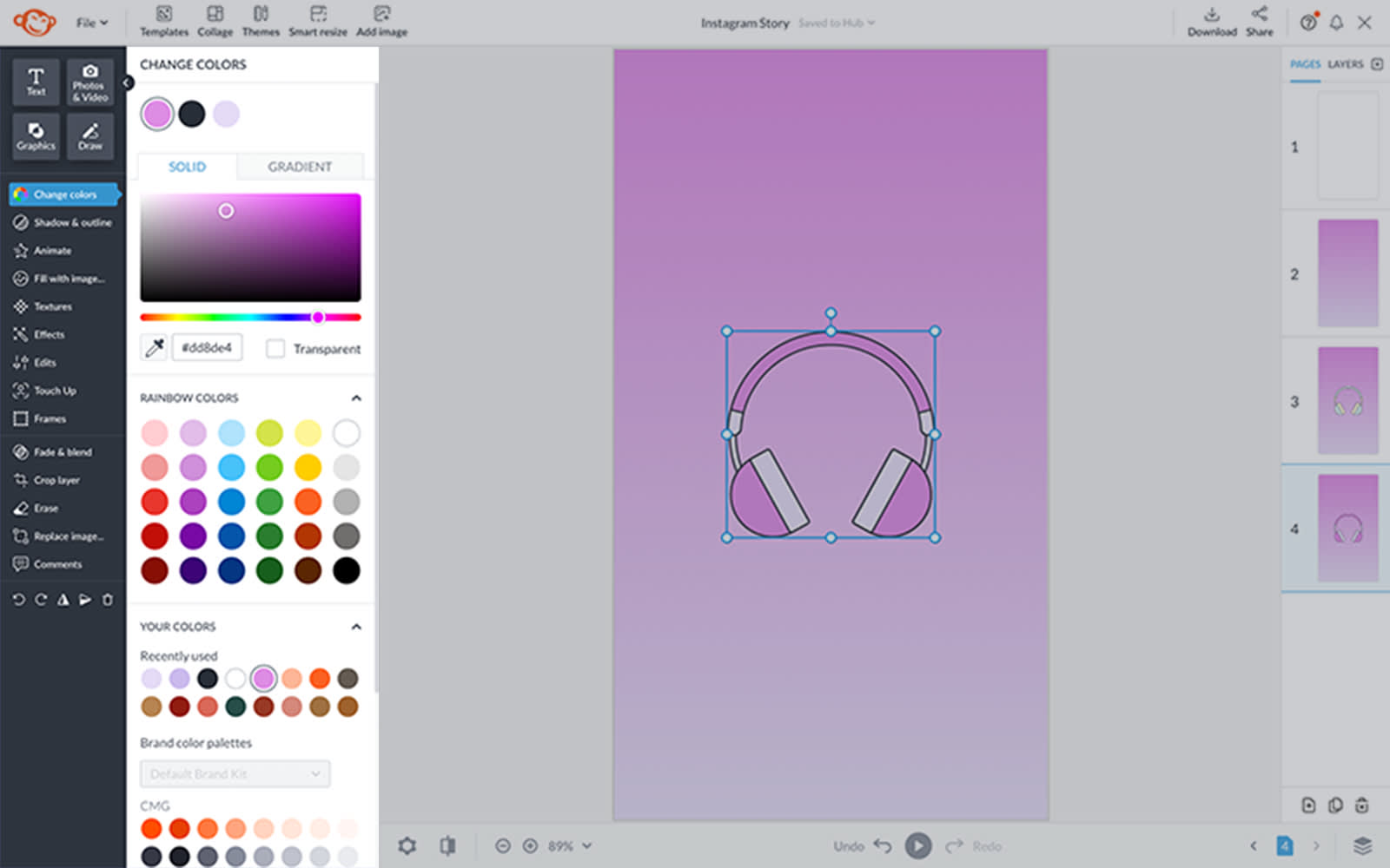 Use the Background Tools menu to select a background color. If you have a branded hex code you want to use, enter it in the text box and click Apply. Otherwise, you can defer to the large selection of common colors or gradient swatches.