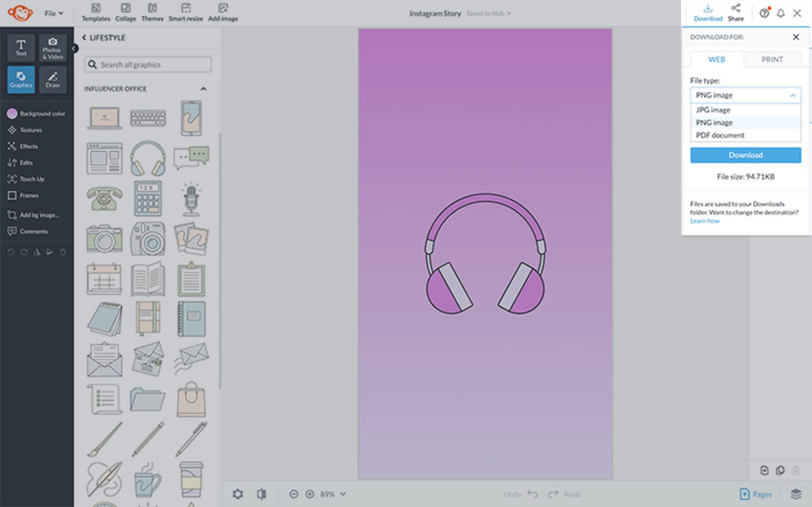 Click Download in the right corner of the top toolbar to save your cover to your computer, then move it over to Instagram when you’re ready. Note that your design always autosaves in Hub, PicMonkey's cloud storage, for unlimited editing.