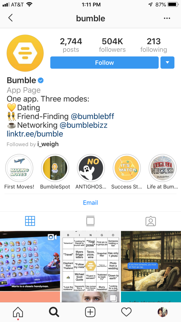 On Bumble's account they have a variety of uniquely branded highlight covers. We’d like to draw your attention to the one labeled “First Moves!” The text has not one, not two, but three drop shadows which help give it a sense of movement.
