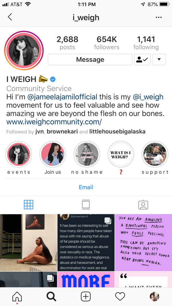 The @i_weigh account uses outlined text in their highlights about not being ashamed. It’s a powerful statement and the text treatment helps to highlight that. The image stays on-brand by using the same pink as the other highlight covers.