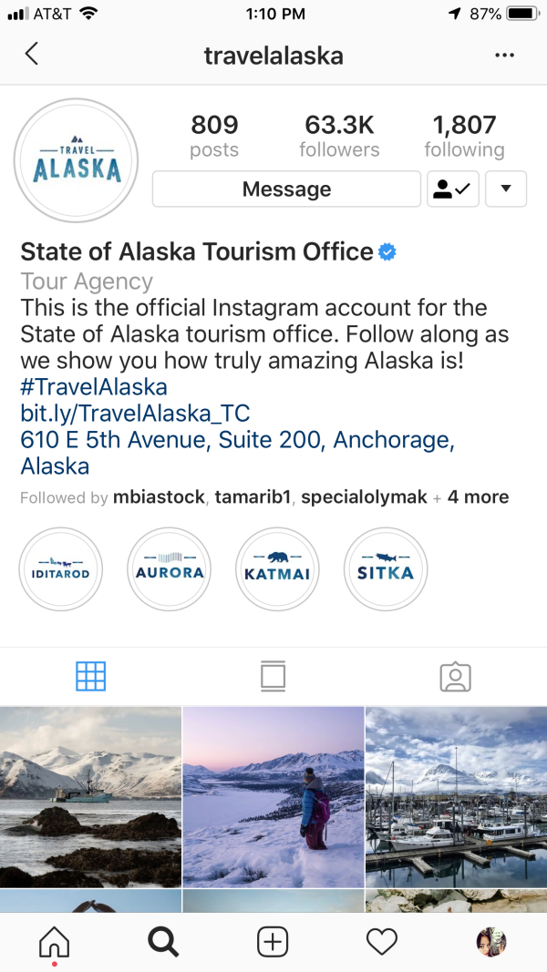 Masking is when an image peeks through another image or text. It’s a quick and easy way to immediately add visual interest, like the State of Alaska Tourism Office did on their Instagram page.