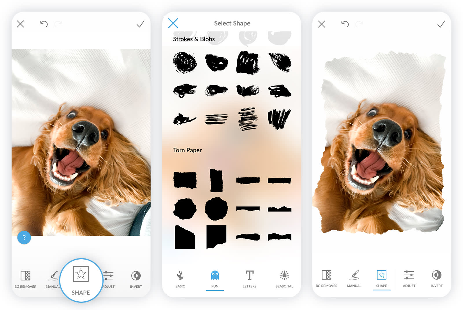 Shape cuts out the background and fits the part you want to keep within the bounds of whatever shape you select. Once you pick a shape, you can adjust its size and placement over your original image.