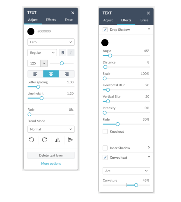 The Adjust section of the Text palette (left) features a fonts drop-down menu, letter and line spacing and more. The Effects section of the Text palette features shadows and curved text.