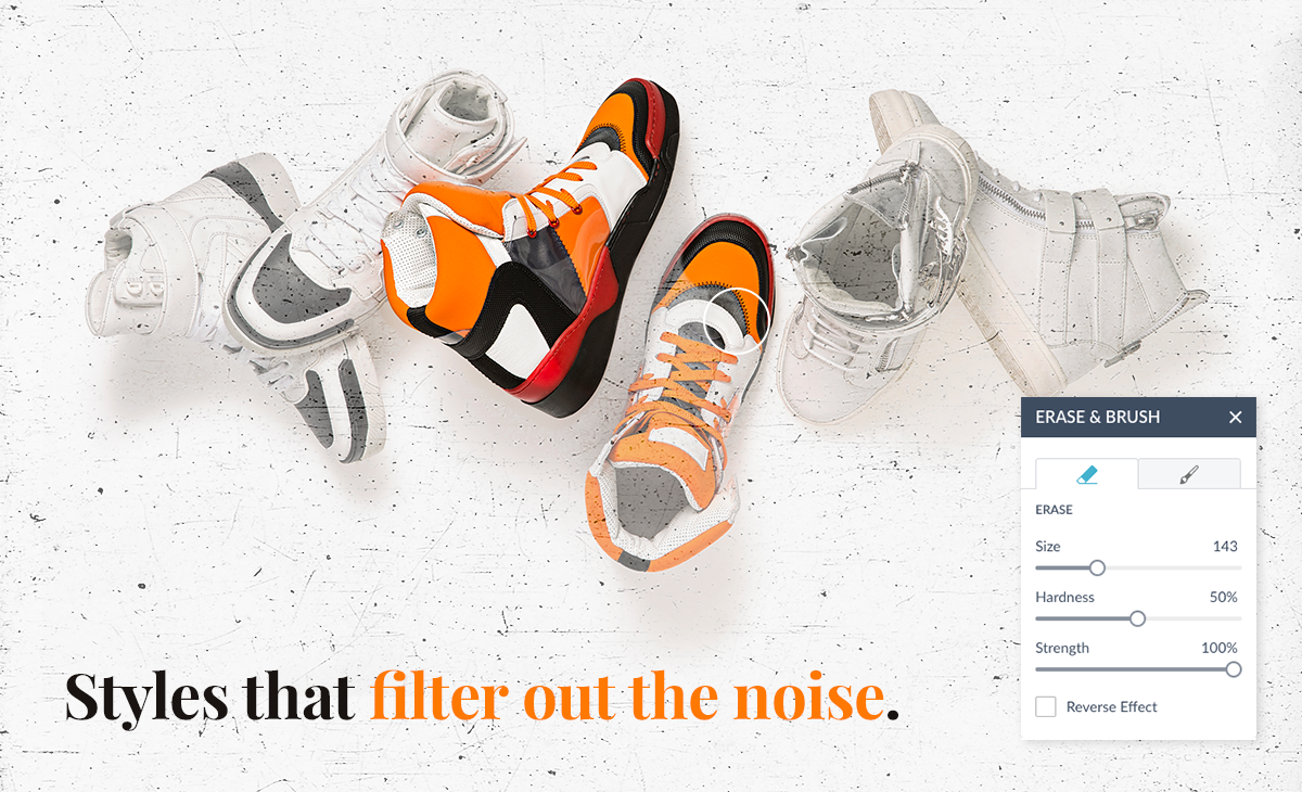 Click the paintbrush icon to the right of your texture’s name and you’ll have access to the Erase & Brush palette. Here you can use a brush of whatever size you choose to brush on the texture in certain places. Use the eraser if you want to remove the texture from a part of your image. The Hardness and Strength sliders will help you adjust the softness of the edges and how much of the texture is applied or removed.