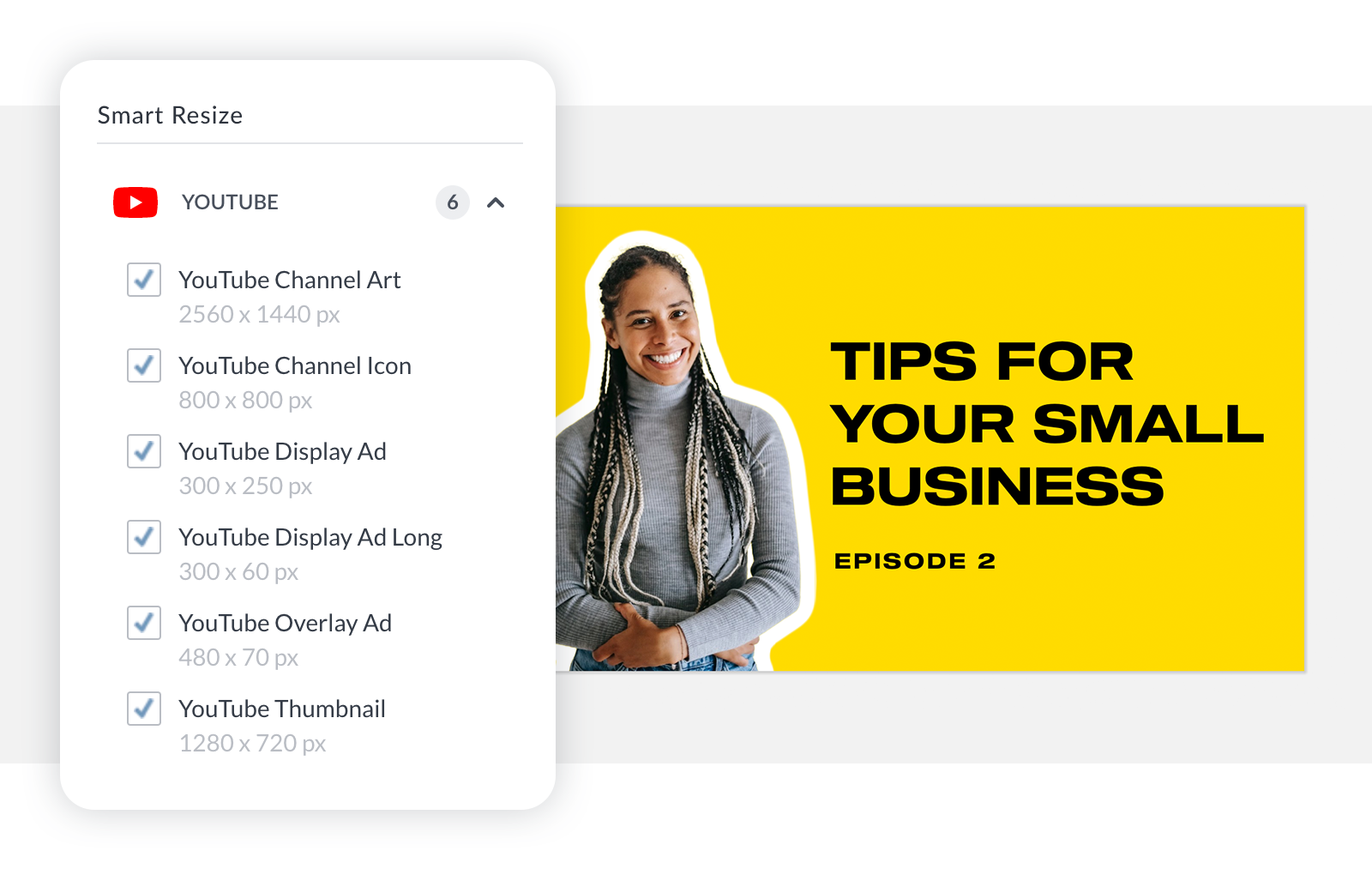 Creating YouTube channel art is a precious operation. There's the design itself, but also the question of sizing. YouTube recommends 2560 x 1440 pixels. This is considered best for computer desktops, but what about people visiting your channel from other devices? That's why you need to account for smaller sizes and design within the "safe zone." You can use one of our YouTube channel art templates or start with a blank canvas — both factor in this "safe zone" so that you never have to worry about your design looking funky on different devices. And if you ever like a design so much that you want to use it in multiple formats, well, then it's time to meet one of the most magical tools around: Smart Resize.
