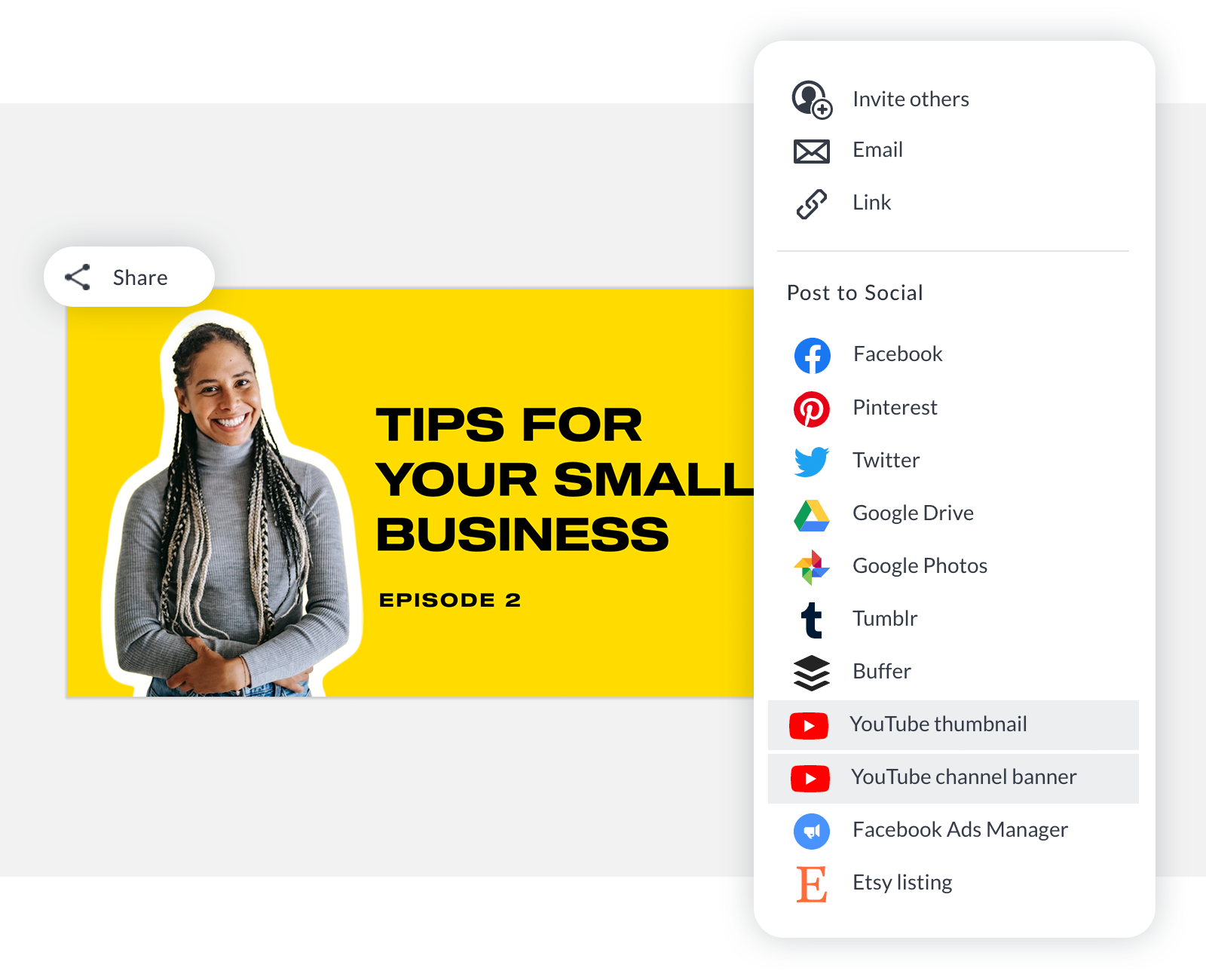 In PicMonkey, click Share on the top toolbar. Select "YouTube thumbnail" or "YouTube channel banner." You'll be prompted to connect your YouTube account in order to share.